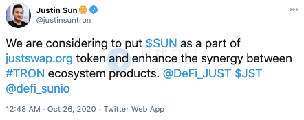 波场创始人孙宇晨发推称,“我们正在考虑让SUN成为JustSwap代币的一部分,同时加强波场生态系统各产品的协同能力。”