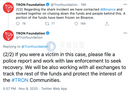 波场基金会官方推特账户证实了此事,并已经联系币安共同追查罪犯者和被盗资金。虽然币安已经冻结一部分资金,但其他交易所也可能参与追讨这笔资金。该团队建议受害者向当地警察提交报告。