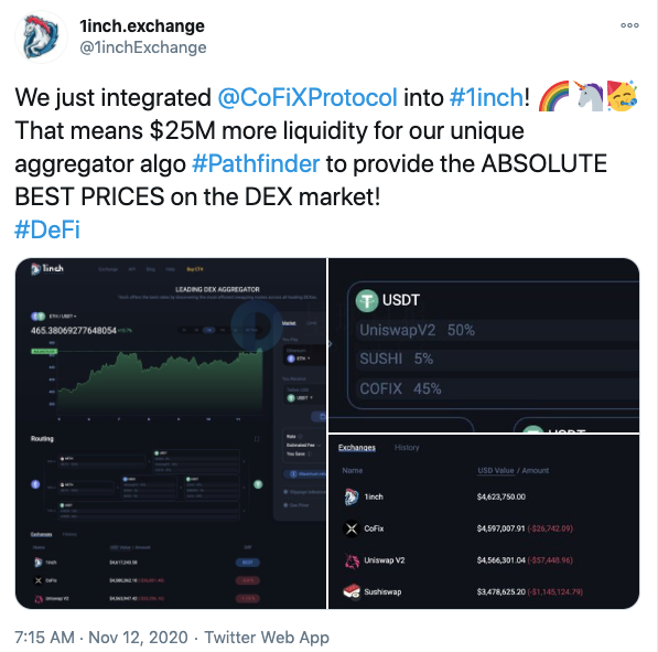 1inch交易所官方宣布:我们刚刚完成CoFiX的聚合,这意味着1inch交易所的流动性增长了2500万美元,这2500万美元将会提供给Pathfinder,为DEX市场提供最优价格。