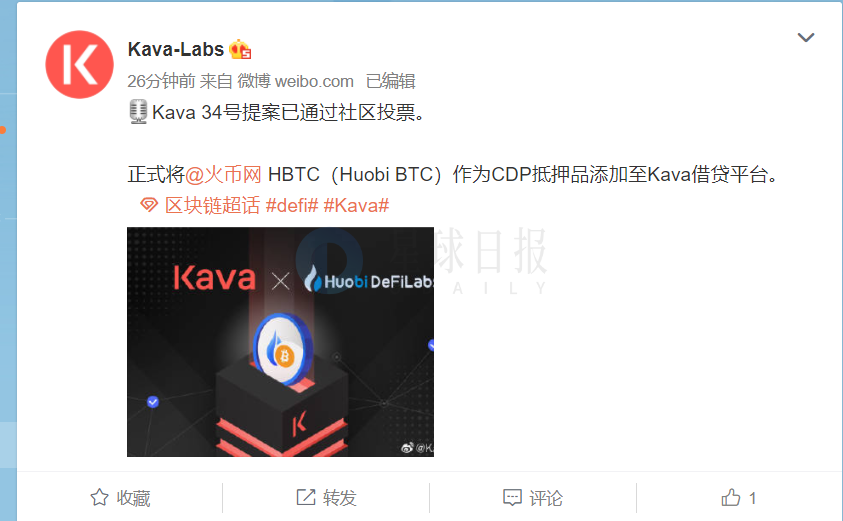 Kava通过社区治理提案 将HBTC作为CDP抵押品添加至Kava借贷平台