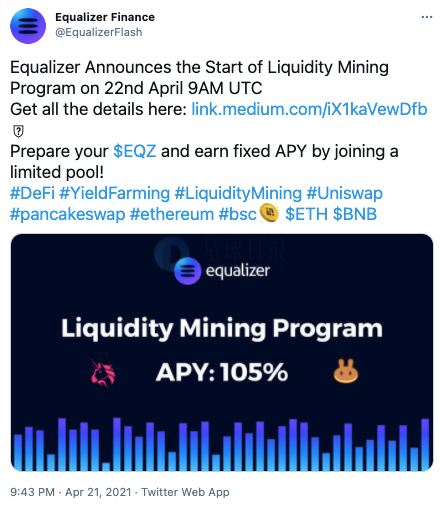 星球日报讯 闪电贷平台Equalizer Finance宣布将于UTC时间4月22日9点(17点)开启流动性挖矿计划。限制规模的质押池将开放一周。流动性提供者可以在以太坊和币安智能链(BSC)链上挖掘流动性,活动时间为120天。