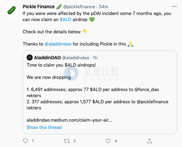 Pickle Finance:去年11月pDAI安全事件受影响用户现可申领ALD空投