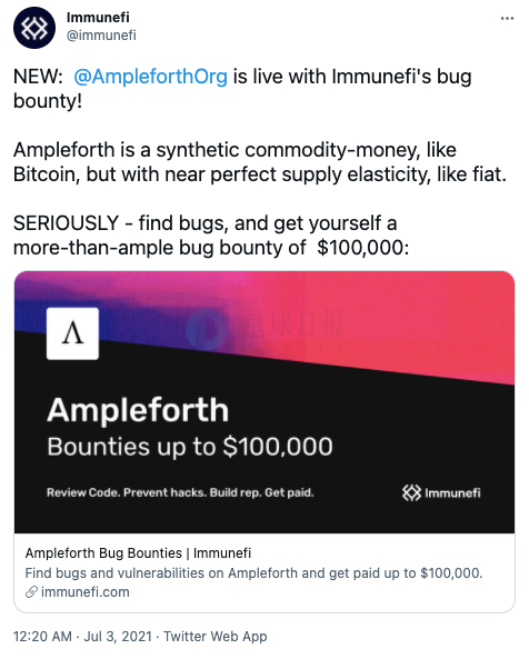 算法稳定币Ampleforth在Immunefi平台推出10万美元漏洞赏金计划