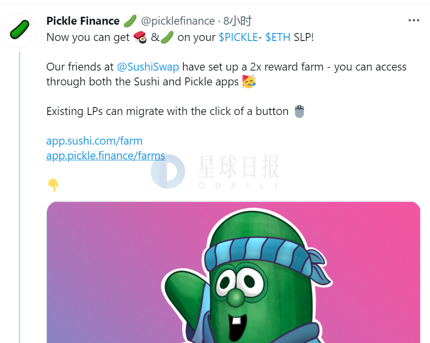星球日报讯 官方消息,Pickle Finance上线PICKLE- ETH SLP双挖奖励,奖励为SUSHI和PICKLE代币,现有LP可一键迁移。