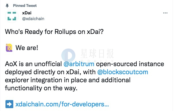 以太坊侧链xDai在推特上表示,已经将以太坊扩容方案Arbitrum的开源实例部署至xDai网络中,该项目被称为AoX。xDai表示,该版本不是由Arbitrum官方部署的,是为了研究和开发目的而部署的。