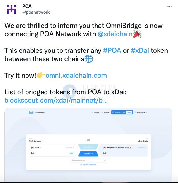 星球日报讯 POA Network在推特上表示,已通过OmniBridge与xDai建立链接,允许用户跨链转移POA或xDai代币。