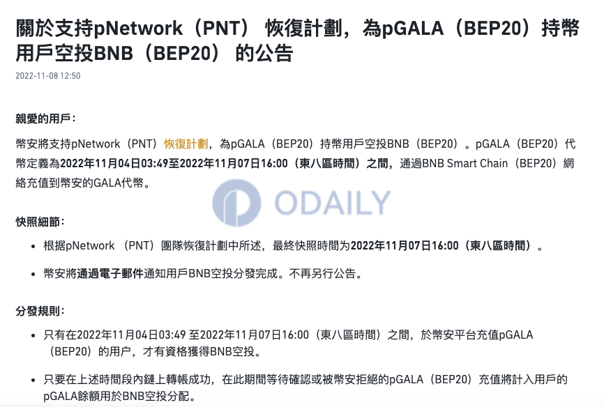 pGALA(BEP20)代币定义为2022年11月04日03:49至2022年11月07日16:00之间,通过BNB Smart Chain(BEP20)网络充值到币安的GALA代币。根据pNetwork (PNT)团队恢复计划中所述,最终快照时间为2022年11月07日16:00。