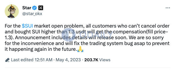 发推表示,对于SUI开市出现的问题,所有无法取消订单并以高于1.3