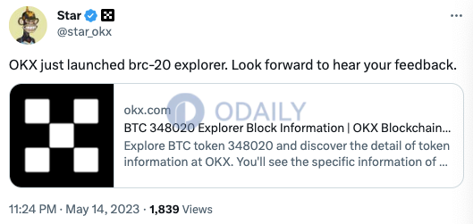 徐明星:OKX已推出BRC-20浏览器