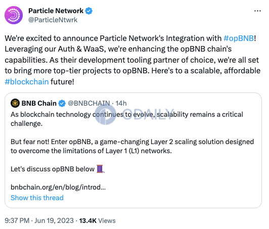 Odaily星球日报讯 Web3中间件平台Particle Network发推称,已集成BNB Chain的opBNB测试网,将通过Auth & WaaS功能增强opBNB网络。Particle Network成为opBNB的开发工具合作伙伴。