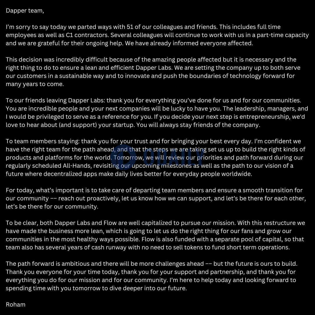 Dapper Labs:已裁员51人,团队资金充足无需出售代币维持运营
