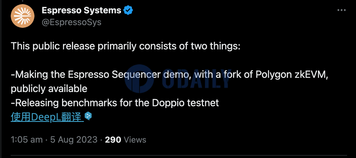 Odaily星球日报讯 据官方消息,Espresso Sequencer测试网版本Doppio已对公众开放,本次公开发布主要包括两方面内容:将Espresso Sequencer demo版本与Polygon zkEVM的分支公开发布,用户可以向在去中心化的Espresso Sequencer上运行的Polygon zkEVM分支提交交易;发布Doppio测试网的基准测试结果。