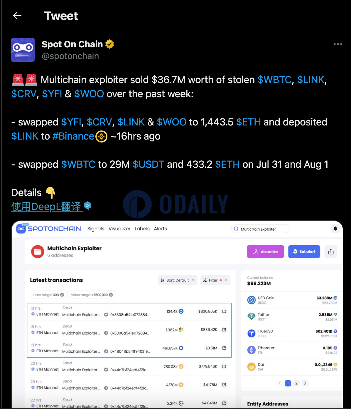 Odaily星球日报讯 据Spot On Chain监测,Multichain攻击者在过去一周内出售了价值3670万美元的资产。其中,将YFI、CRV、LINK和WOO兑换为1443.5枚ETH,并且此前将WBTC兑换为2900万枚USDT和433.2枚ETH。