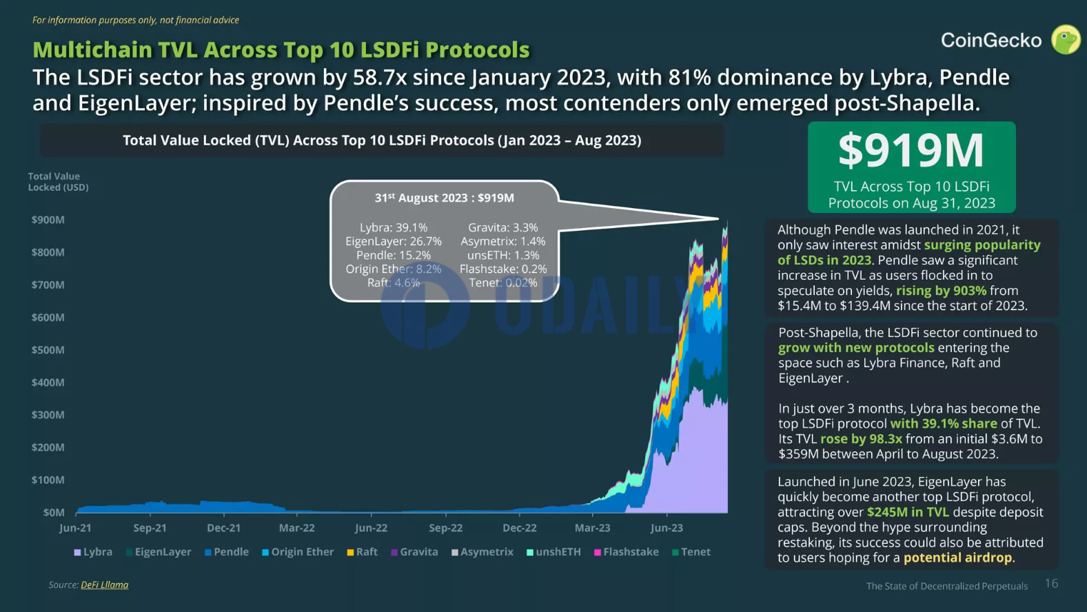 Odaily星球日报讯 由于ETH持有者选择质押而不是抛售代币,以太坊流动性质押衍生品金融(LSDFi)生态在今年增长势头迅猛。尽管2023年4月以太坊Shapella升级启用ETH提款,但加密数据聚合商CoinGecko于10月16日发布的报告表示,截至2023年8月,LSD协议占质押ETH总量(2640万枚)的43.7%,其中Lido占据最大份额,几乎占质押市场总量的三分之一。十大LSDFi协议(不包括Lido)总锁仓量(TVL)自1月以来增长58.7倍。