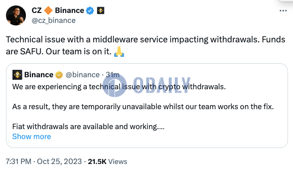 CZ:暂停提款系受到中间件服务技术问题影响,资金安全