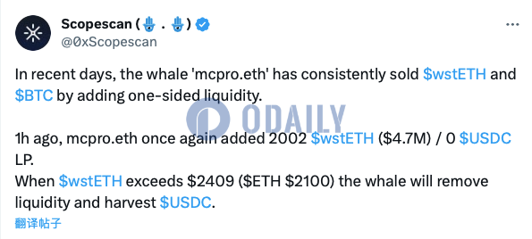 Odaily星球日报讯 Scopescan监测显示,鲸鱼地址mcpro.eth近期一直在通过增加单边流动性的方式持续抛售wstETH和BTC,该地址于1小时前再次添加2002枚wstETH单边流动性,当wstETH价格超过2409美元(ETH价格到达2100美元)时,该鲸鱼地址将消除流动性并兑换为USDC。