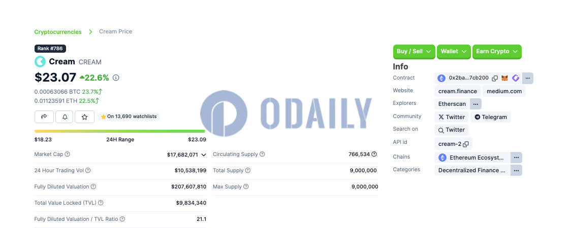 Odaily星球日报讯 CoinGecko行情显示,CREAM暂报23.07美元,24小时涨幅为22.6%。