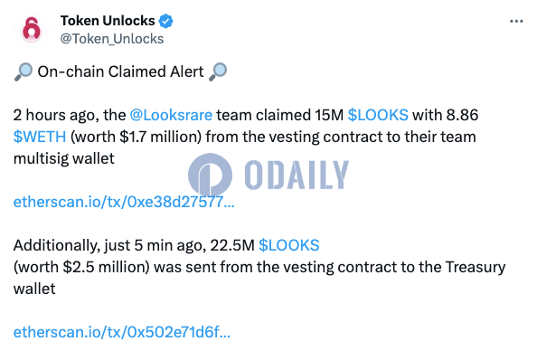 此外,5分钟前2250万枚LOOKS(约合250万美元)从解锁合约中被发送到财库钱包。