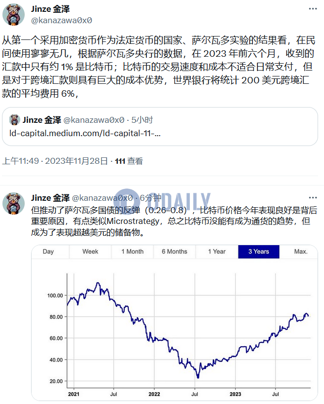 Odaily星球日报讯 LD Capital研究员@kanazawa0x0于X平台发文表示,萨尔瓦多比特币的民间使用率低,近六个月汇款中仅1%为比特币,但推动了萨尔瓦多国债的反弹。比特币未能有成为通货的趋势,但成为了表现超越美元的储备物。