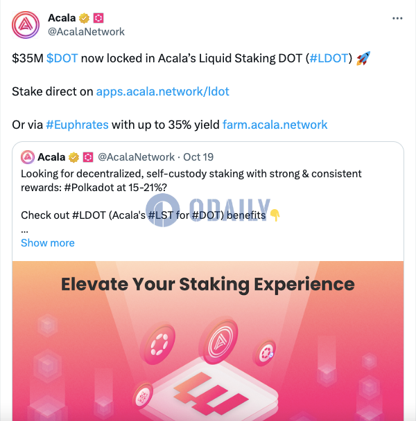 Odaily星球日报讯 Acala在X平台发文表示,目前其Liquid Staking DOT(LDOT)中已锁定3500万美元DOT。