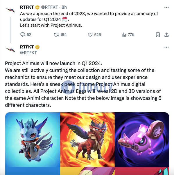 RTFKT计划2024年Q1推出新数字藏品Project Animus