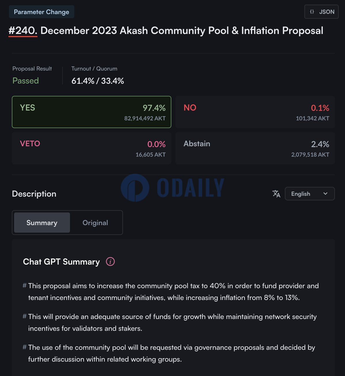 Odaily星球日报讯 去中心化AI算力Akash Network表示以97%支持率通过240号提案,将社区池税收上调至40%,同时将通胀率从8%提高至13%。