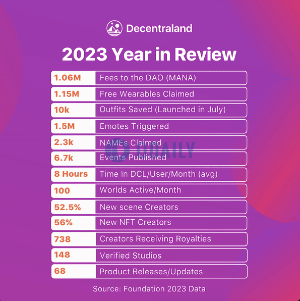 Odaily星球日报讯 Decentraland发布2023年年度报告(以及Q4更新),回顾了平台新功能、平台更新、以及社区活动。