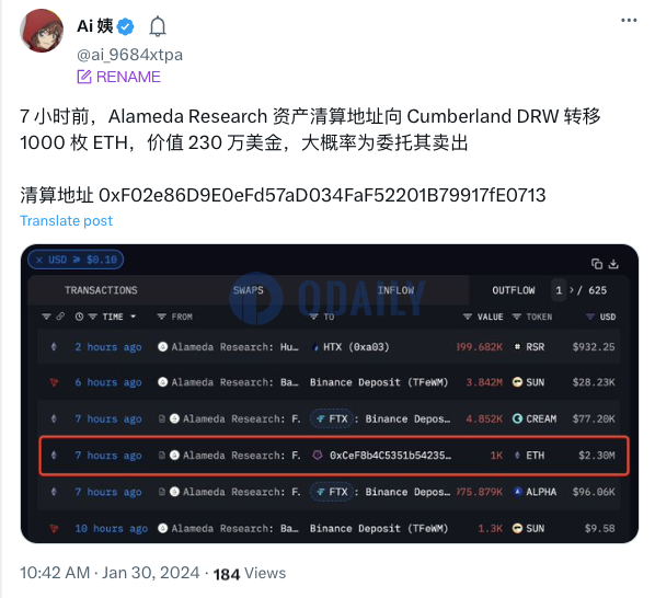 Odaily星球日报讯 据链上分析师@ai_9684xtpa 监测,7 小时前,Alameda Research 资产清算地址向 Cumberland DRW 转移 1000 枚 ETH,价值 230 万美金,大概率为委托其卖出。