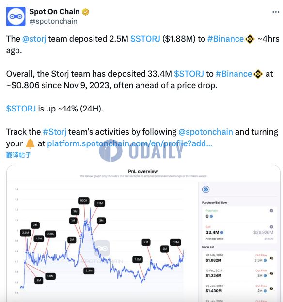 Odaily星球日报讯 据 Spot On Chain 监测,Storj 团队在 4 小时前向币安存入 250 万枚 STORJ(约合 188 万美元)。 自 2023 年 11 月 9 日以来,Storj 团队已经以 0.806 美元均价向币安存入 3340 万枚 STORJ。