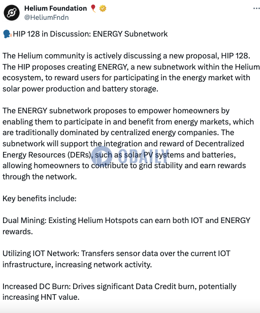 Odaily星球日报讯 Helium Foundation 在 X 平台发文表示,Helium 社区正在讨论新提案 HIP 128,该提案建议创建 ENERGY 子网(Subnetwork),通过太阳能发电和电池储能奖励用户参与能源市场。
