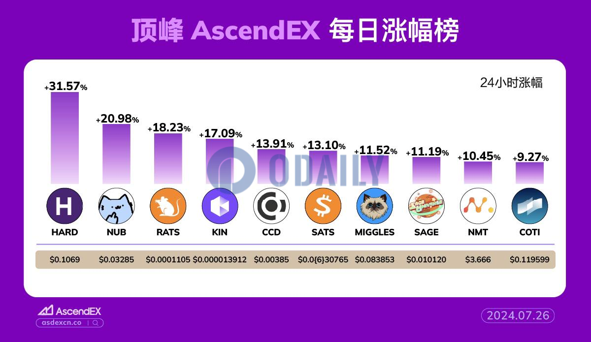 AscendEX每日行情:KAVA链上借贷协议HARD 24小时涨幅达31.47%