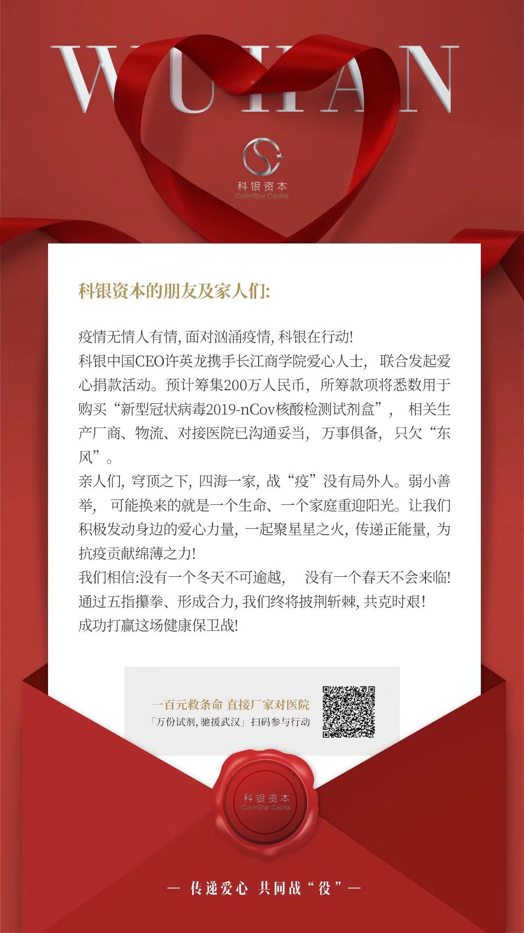 科银资本在腾讯公益平台发起募捐活动(5A公募基金执行,不收管理费,每个人或单位捐资都可以开具发票),捐资直接进入基金会账户专款专用于购买2万份试剂盒支援前线。