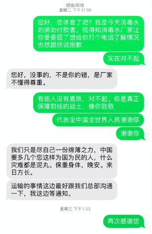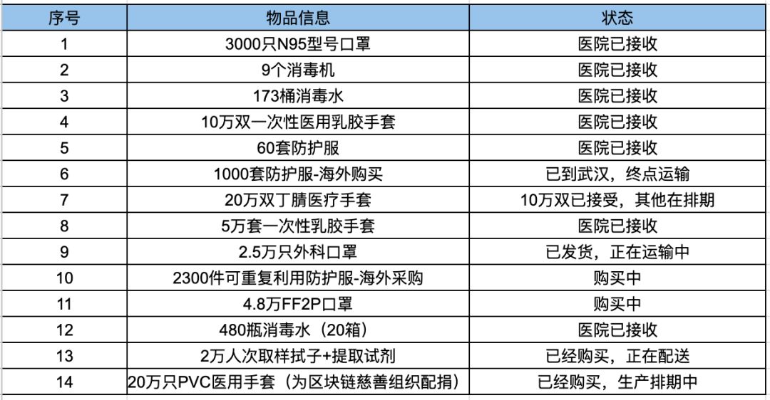 1 月 28 日,币安通过区块链公益组织,联系上了山东的一家厂商,订购了 200 桶(合计 5 吨)消毒水。