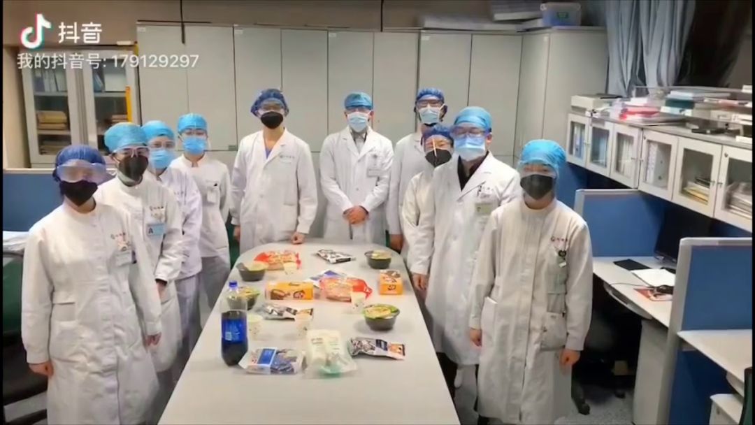 当晚比春晚更受关注的,是网上流传的疫区照片与视频:除夕夜,因为外卖停止配送,武汉同济医院医生们的年夜饭只能是方便面和饼干。