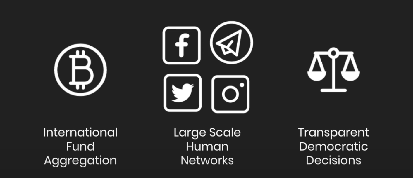 此项目旨在通过结合如图所示的三个方面——国际范围内的基金聚合、大范围的人际网络,透明的民主决策,创造一个更好的募捐和发行模式。