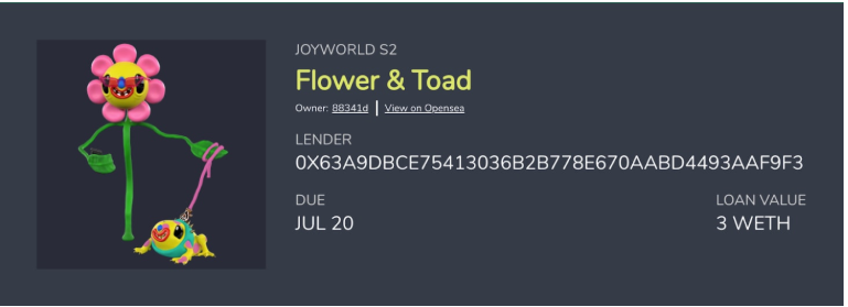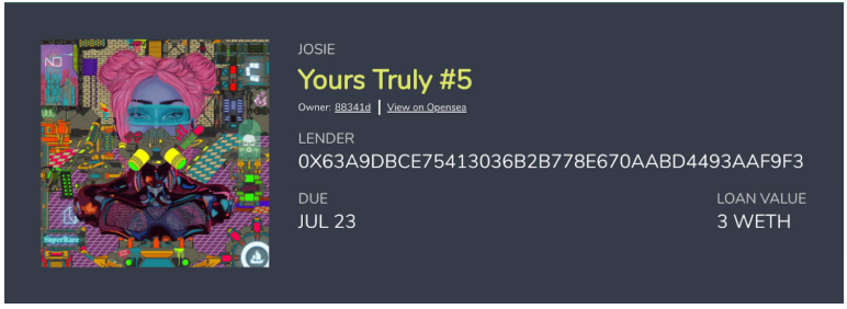 NFTfi是一个简单的NFT抵押贷款的点对点市场。 NFTfi允许您将任何ERC-721 NFT资产作为贷款的抵押品,或在其NFT上向其他用户提供贷款。 一旦贷款开始,NFTfi就会将资产托管起来。 如果借款人偿还贷款,资产将被转回给他们——如果没有,资产将被转给贷款人。在传统艺术界,这被称为无追索权贷款。