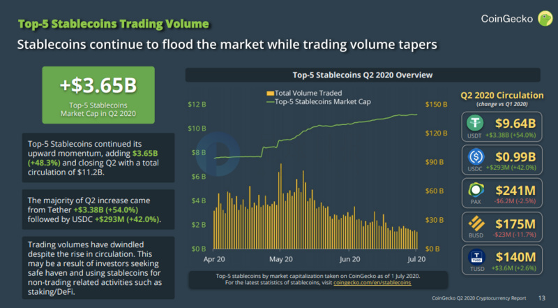加密货币分析公司CoinGecko发布《2020年第二季度稳定币的发展报告》。报告显示,在第二季度,排名前五稳定币(USDT、USDC、PAX、TUSD、BUSD)的市值增加36.5亿美元,相比第一季度增长48.3%,主要贡献来自于USDT。USDT在第二季度市值增加33.8亿美元,环比增长54%。USDC紧随其后,市值增加2.93亿美元,环比增长42%。(CoinGape)