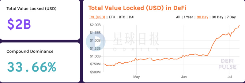 DeFi Pulse数据显示,DeFi生态中锁定资产总价值持续攀升,已达20亿美元,其中Compound占比达33.66%。