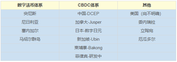 目前已经对外公布自身数字货币计划的国家中,除了美国尚不明确,以及早前采用数字法币体系的突尼斯等非洲国家,大部分国家都采取了以央行发行为基础的 CBDC 体系。
