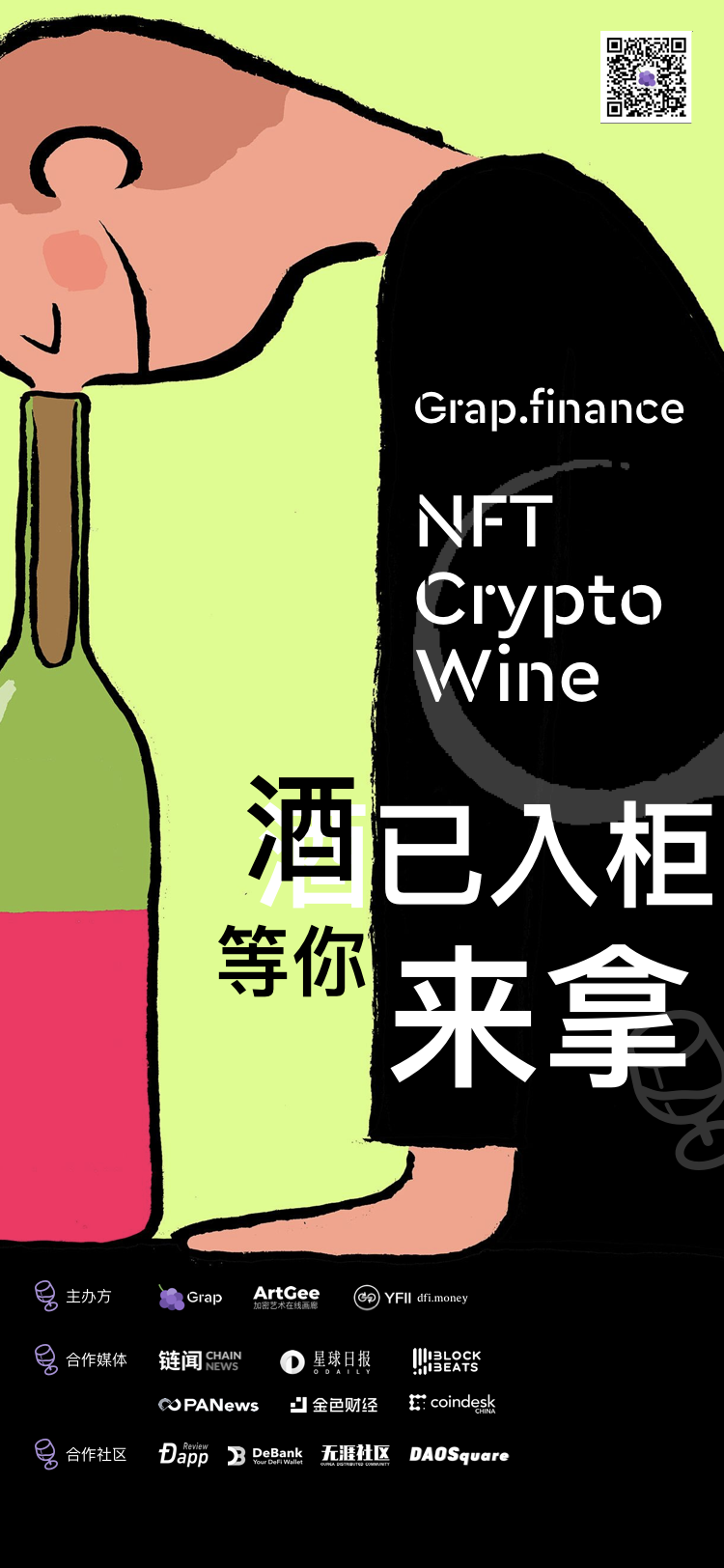Crypto Wine,一个全新的文化实验。脱胎于 GRAP(https://grap.finance/),把文化元素、Meme、区块链世界的印记酿成酒,现阶段可以通过质押流动性进行无损投资获得。每一枚CryptoWine 都符合ERC-721 标准,并且拥有艺术家的独特印记。所有艺术家在未来都能通过各种方式投稿,并且将自己的ID 和以太坊地址永久留存在NFT 上。