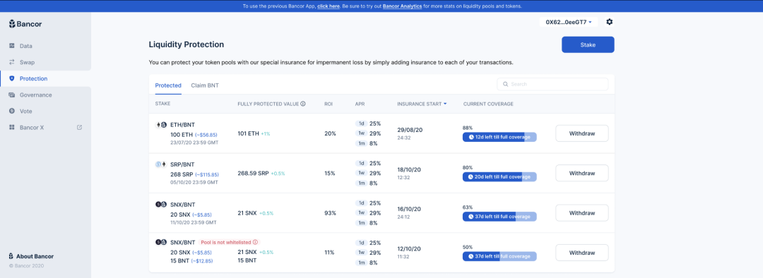 用户可在app.bancor.network质押和获取无常损失保险(指南);