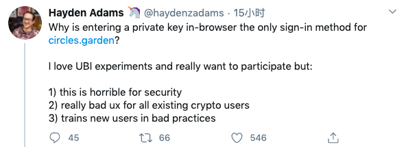 Hayden 认为,Circles 要求在浏览器内输入私钥的登录方式不够安全,除体验不佳外,还会让新用户养成坏习惯。此外,或许是由于用户参与情绪太高,今日下午有大量用户反映,Circles 的服务器已明显力不从心——「试用 10 分钟,9 分半在 loading」。Odaily 星球日报试用后确实感觉到,迟缓的网页反应速度和拥堵的网络严重影响了用户体验。