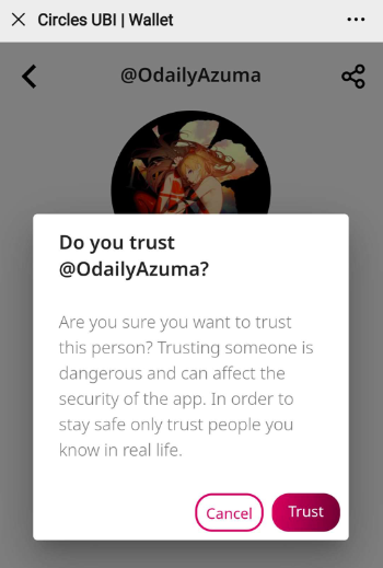 Circles 希望通过社交方式来实现这一功能。为了赋予每种个人货币实用性,不让其变成毫无作用的数字。Circles引入了「信任(Trust)」这一概念,用户可以选择信任彼此的个人货币,进而促成交易。当用户点击「Trust」,选择信任其他人的个人货币时,就等于告诉了系统被选定的个人货币等同于自己已拥有的任何其他货币。这意味着任何拥有这种可信货币的人都能以1:1的汇率将该货币与自己持有的货币(不一定是自己的)进行交易。