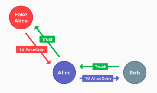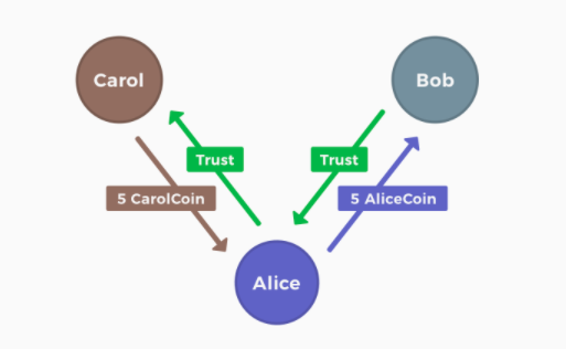 其他人不能再使用 Alice Coin 来换取 Bob 手中的 Bob Coin,但 Bob 可以使用自己手中的 Alice Coin 与信任 Alice 的其他人进行交易,换回自己想要持有的其他货币。