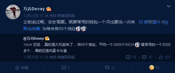 日前DEX 1inch发币空投之时,Primitive Ventures创始合伙人万卉在微博上透露自己拿到超过100000枚INCH,因为出于安全的考虑,经常更换钱包地址,并且有一个资产一个地址的习惯。光这个空投,以上线当天2美金的单价计算,万卉就拿到了北京一套房。