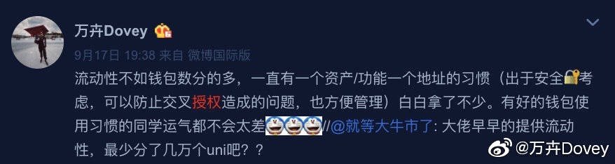 我们散户们必须知道,万卉是有着非常好的加密资产管理意识,并且能够严格执行自己的安全策略,是她能拿到这么多空投的基础,对于DeFi产品的理解都只是次要因素。而神鱼作为最大矿池的创始人,相信早已财富自由,却依然积极的在每个热门的DeFi项目中参与,每天8点抄底BAB,保持对新鲜事物的敏感度、学习能力、热情,是他能捡到大空投的原因。哪怕专业的羊毛党,也是配置了专门的羊毛工具、熬夜撸羊毛的。