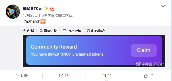 同样,鱼池的创始人神鱼也晒出了自己拿到的1inch空投,多达8万枚1inch,网友在底下评论,是“撸废了多少DeFi项目,才有这么多羊毛”。