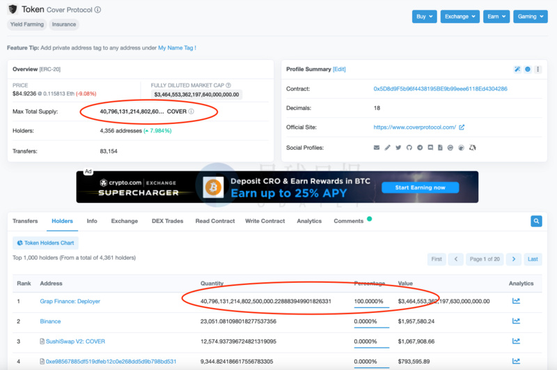 区块浏览器显示,目前 Cover Protocol 原生代币 COVER 的总量已被增发至 40,796,131,214,802,600,000 个(4000京个,基本等于无限增发),一个标签为 Grap Finance 的地址增发了这些代币,并在 DEX 中持续抛售。