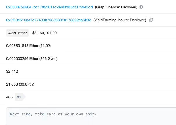 目前第一波黑客身份不明,但第二波增发的黑客地址,被网络标记为 Grap Finance 开发者的地址。在获利后,该攻击者将所得收益还给了 Cover 团队,销毁了剩余增发的 COVER ,并给 Yield Farming 保险地址(Cover 协议的前身)留言:下一次,管好你自己的事。