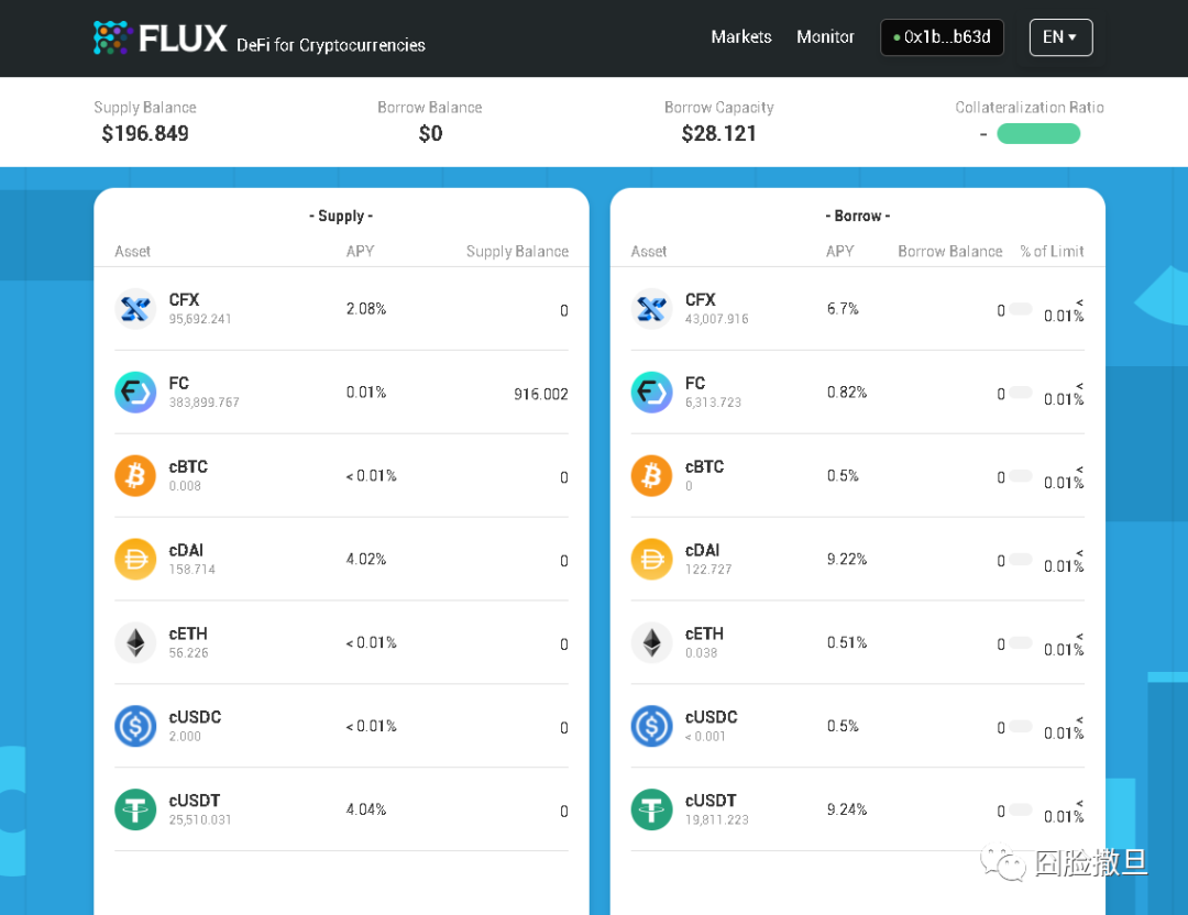 DeFi在这超过半年时间内的火爆里,让币圈见识了它的魔力和潜力,也让人深刻体会到了以太坊的贵、堵、慢。不是每个人都体验过加密猫的盛况,但现在可能每个人都知道了以太坊Gas费的痛。Gas费和交易速率的问题挡住了很多用户,我们看到无论是币安智能链还是火币生态链在近期都相当火爆,而以太坊明显的受到了影响,Bas熄火之后,Gas费已经回到了平均水平。以太坊上每日Gas的价格,近期ETH价格上涨,Gas费却在降低,说明链上活跃度下降用户用脚投票的同时,开发者们也会寻求有更大用户规模和增长空间的区块链网络,实现自己的加密梦想。基于Conflux网络的抵押借贷协议Flux就是这个趋势下出现的产品。Flux自身对去中心化抵押借贷的探索,辅以Conflux网络赋予的优势,能够提供与当前主流DeFi借贷协议不一样的感受。类似于Compound、AAVE,Flux同样是抵押借贷产品,支持用户存入、贷出相关的加密资产,Flux如同银行,将资产富余人的钱,借给需要资产的人,是最基础的金融活动之一,产品逻辑简单清楚。当前Conflux链上的资产并不多,原生资产有CFX和FC,但借助于Conflux的跨链方案,目前Flux可以支持BTC、ETH、DAI、USDT和USDC这些主流资产。去中心化的一个重要优势在于公开透明,点对点的交易也免去了中间环节的费用。但以太坊的高Gas费用,让这个优势荡然无存,甚至成了阻碍。以太坊用户普遍面临的问题,每参与一个DeFi协议,去提供资金、提供流动性时,明明是在为这个协议做贡献,却被收取了高昂的手续费,尽管手续费并非被这个协议所收取。这如同在现实生活里,你去银行存钱,却被告知要先交一笔手续费,这是无法忍受的。而在Flux上去做存款借贷,则没有这样的成本问题。以下为在Flux进行一笔存款的手续费用,笔者将所有的代币都存入了Flux,确认交易时一度担心没有余额支付手续费导致交易失败,然而惊喜出现了。左侧为Flux上的存款交易,手续费为0,右侧为Gas在47的低水平时一笔以太坊交易手续费,达到了12美金由于Conflux手续费代付机制的存在,我这笔存款的手续费是0,真正做到了和去银行存款一样的体验。而一笔类似的交易,在以太坊上,我们需要花费接近20美金的手续费。这带来的影响并不是简单的用户门槛降低,而是涉及到整个DeFi生态可玩性的重要问题。基于Flux这样低费的交易,DeFi的可组合性、可玩性能够得到非常大的发挥。首先是自己的资产利用率能够提高,各种协议间的套利更加便利。由于手续费代付机制的存在,覆盖了用户很多的成本,因此经济模型出现变化,有了更多的套利机会。用户可以在Flux中借出某种资产,在交易市场上进行交易,由于借款成本很低,交易利润不需很高就能够轻易的覆盖成本,从而获取利益。与此同时,你同样获取了存款利息,这等于在市场下行期间,用很低的杠杆去完成套保操作。具体操作里,我们可以通过Flux、Moonswap、Moondex等Conflux链上生态的综合应用,完成套利、套保,整个过程非常快速、低费。假如我们以太坊上进行这样的套利、套保操作,可能需要你套利交易获得超过5%的利润才能获利,而在Flux中,2%的交易利润都足以支撑你的一系列操作成本。Flux还可以让用户实现跨链的套利。当前,Flux上cDAI和cUSDT的借款利率是9%,而AAVE上的DAI和USDT存款利率达到了11%和23%,用户可以在Flux上借出DAI或者USDT,通过Conflux的跨链转换,来到AAVE中存款,赚取高达10%的利差,可以说是空手套白狼。另外,由于手续费代付机制的存在,全额用于Flux存款成为可能,不会在钱包里留下那些放弃了心里觉得可惜,却又用不起来的小额资产。同样值得一提的是Flux这样的便捷快速,并非牺牲安全性而来。或许很多POS公链都能提供这样的体验,但在安全性、去中心化程度上,POS公链难比POW公链,因此在Flux上进行DeFi借贷的安全系数相比也更加高。Flux的这个安全性还体现在Flux团队对产品代码的打磨,以及对清算机制的创新。FLUX 开发的自动清算机制,当清算被触发时,直接进行清算,不需要竞价过程,执行效率高,能够抵御价格下行风险,做到即时快捷清算,有效保护资产安全。当前Flux还处于发展初期,还未发行项目代币,各种借款利率也很低,非常适合各种套利交易。在DeFi的早期,都是这样的套利者从中获得了高额的收益,并且得到了部分项目的代币空投,Flux目前提供了这样的机会。